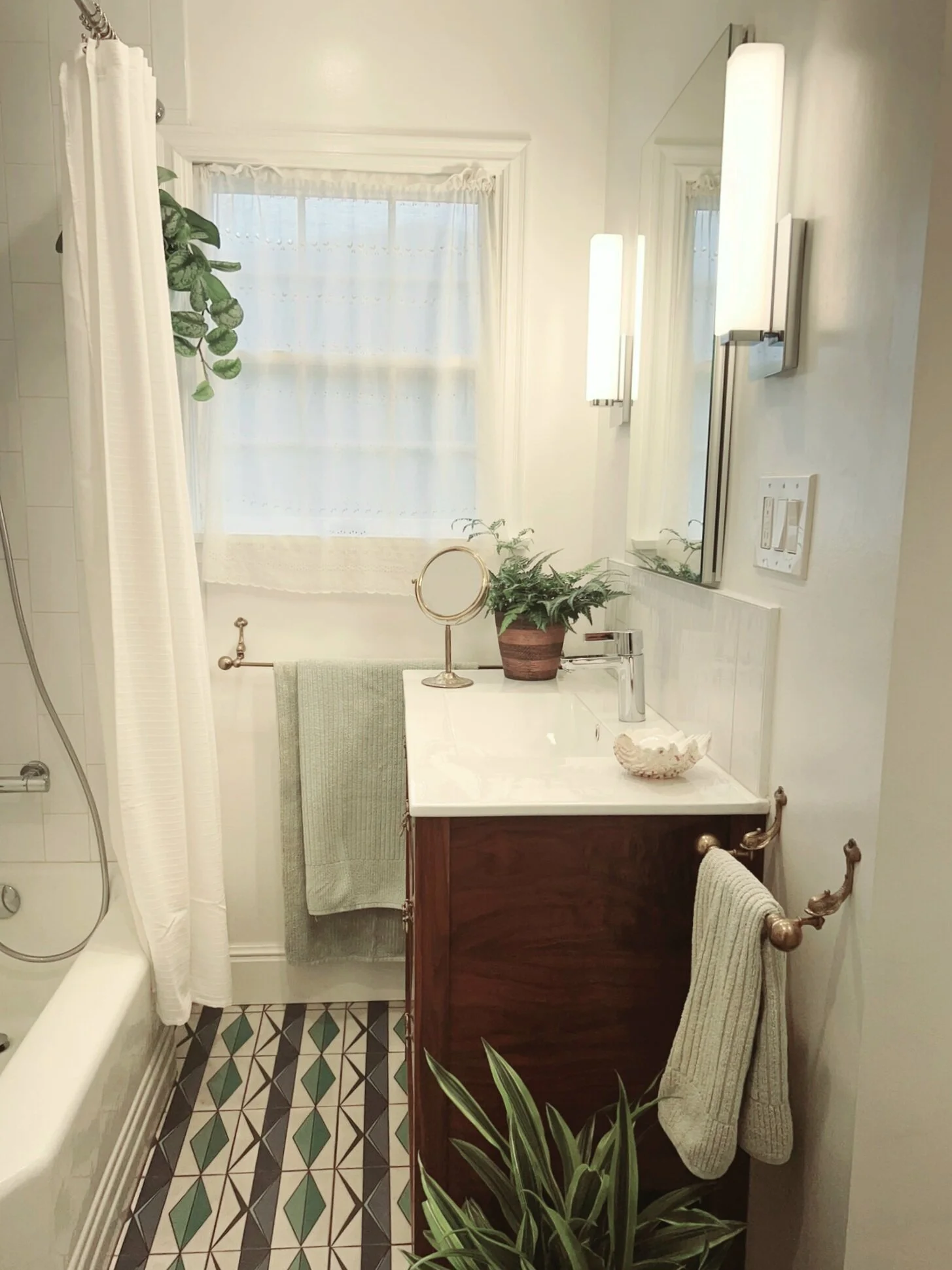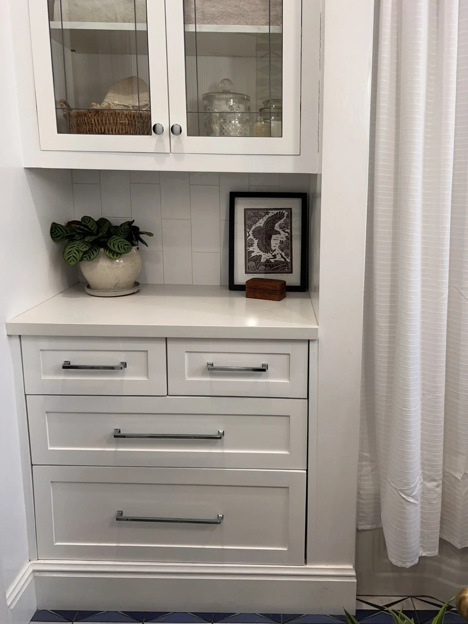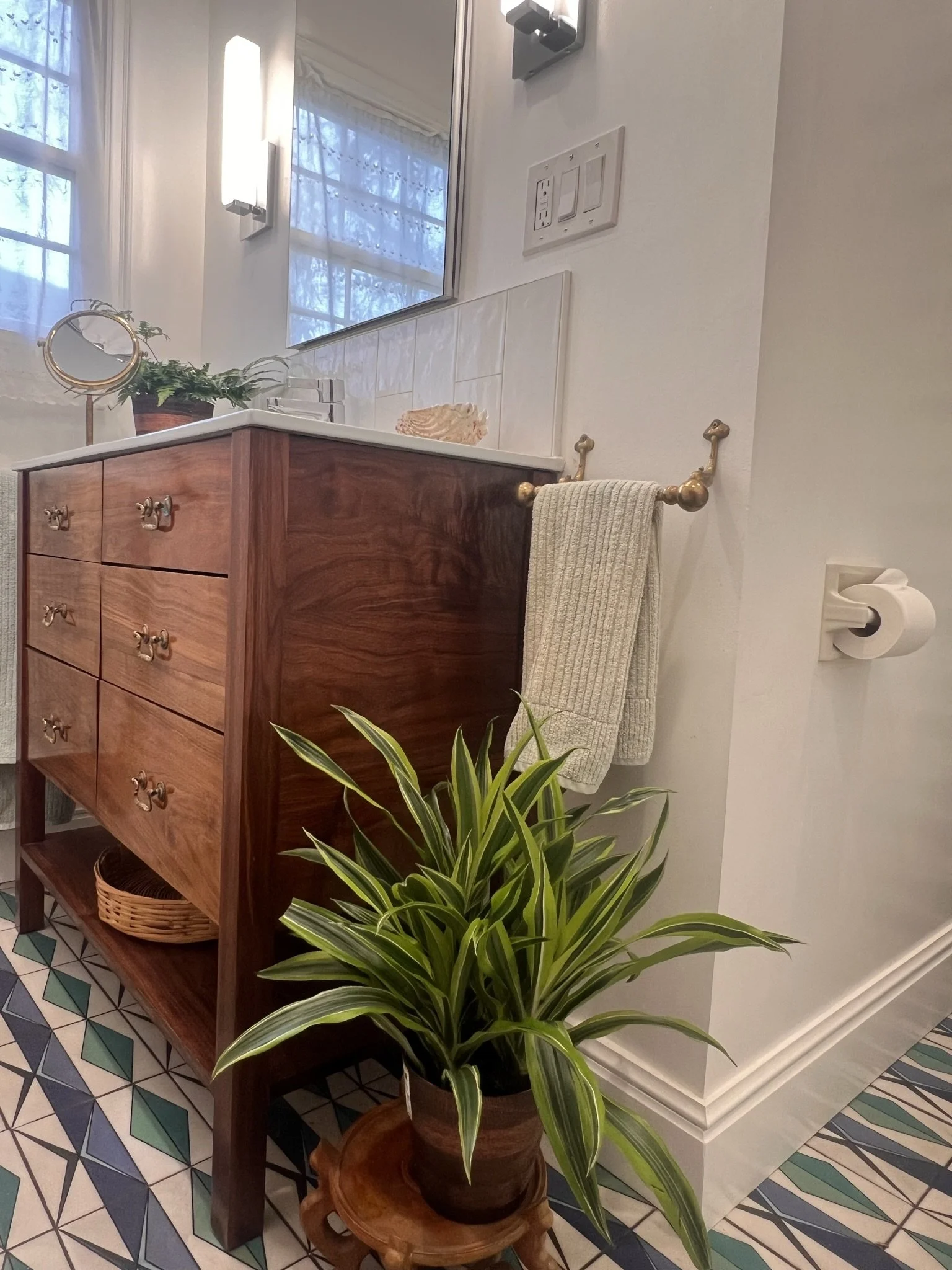 An extensive bathroom remodel featuring a custom tile and hand-built vanity.